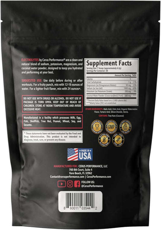 30 Servings of Watermelon Flavored Cerus Performance Electrolyte Powder with Coconut Water & Real Fruit for Endurance & Recovery - Zero Sugar
