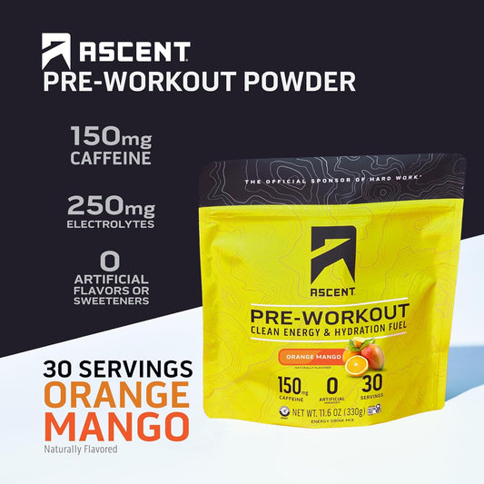 All-Natural Ascent Pre Workout Powder - Clean Energy with 150g Caffeine & 250g Electrolytes - Orange Mango Flavor - 30 Servings for Men & Women
