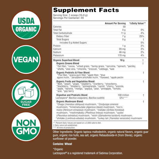 Organic Super Greens Chocolate Drink Mix with 50 Superfoods, Mushrooms, and Probiotics for Energy - 40 Servings, 10.6 Oz (2 Pack)