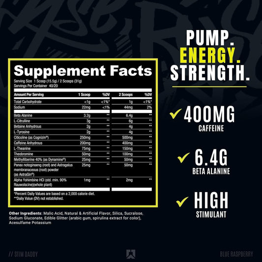 RYSE Up Supplements Stim Daddy Pre Workout - High Stimulant Formula with 400mg Caffeine - Blue Raspberry Flavor - 40 Servings