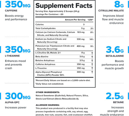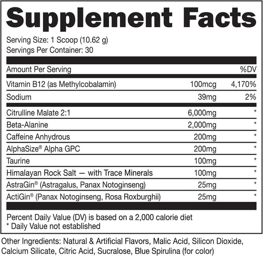 Blue Raz Pre Workout with 6g Citrulline, 2g Beta Alanine, & 3 Trademarked Ingredients