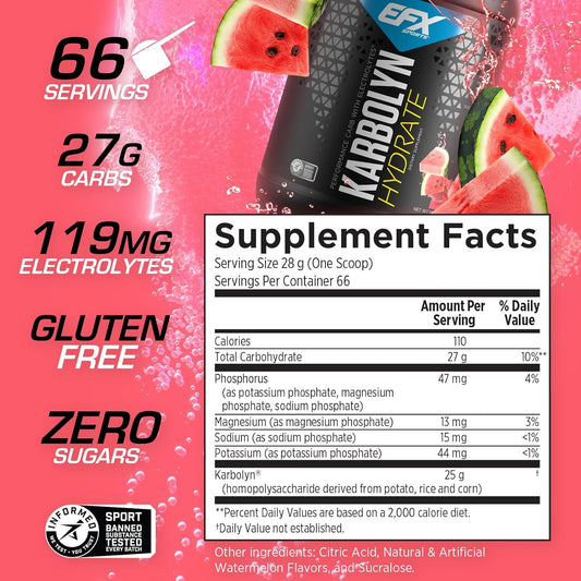 EFX Sports Karbolyn Hydrate Watermelon Wave - Sugar-Free Carbohydrate Powder with Electrolytes for Fuel & Hydration - 66 Servings