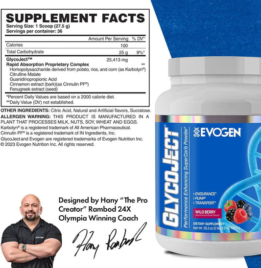 Evogen GlycoJect Super Carb Powder - Wild Berry Flavor - Pre & Post-Workout Carbohydrate Supplement - Rapid Absorption for Men and Women - 36 Servings