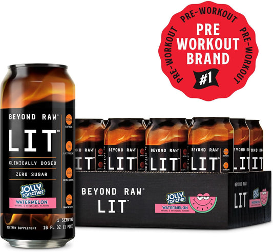 BEYOND RAW LIT Ready to Drink Cans - Jolly Rancher Watermelon Flavor - 12 Pack with Caffeine, L-Citrulline, Beta-Alanine