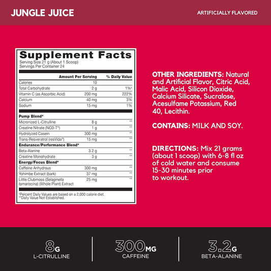 BSN N.O.-XPLODE Vaso Pre Workout Powder - Jungle Juice Flavor, 8g L-Citrulline, 3.2g Beta-Alanine, Energy Boost - 24 Servings