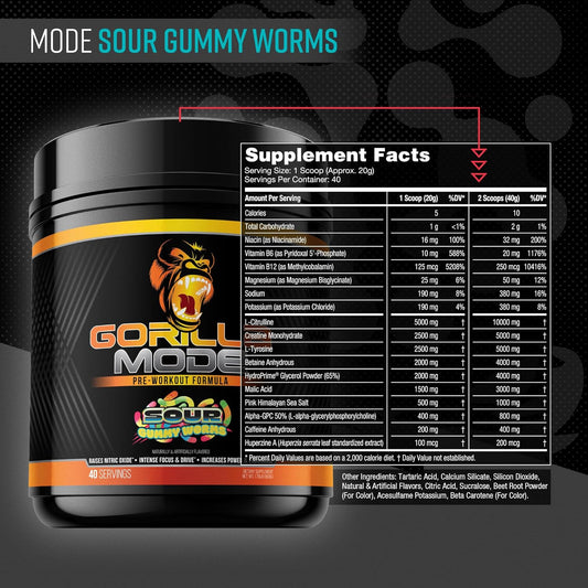 Gorilla Mind Pre Workout Supplement - Enhances Energy, Focus, and Power - 400mg Caffeine, Creatine, L-Citrulline, L-Tyrosine - Sour Gummy Worm Flavor - 800g