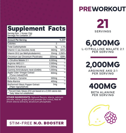 Zero Ultra Clean Blackberry Lemonade Non-Stim Pump Pre Workout for Men & Women - Beetroot, Arginine, Citrulline Malate, Betaine, Beta A, ACV - Sugar-Free & Caffeine-Free Formula