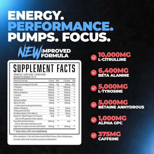 Advanced Pre Workout Powder with Powerful Formula for Boosted Energy, Focus, and Performance - 10g L-Citrulline, 6.4g Beta Alanine, 5g Tyrosine, 1g Alpha GPC, 375mg Caffeine - 40 Servings