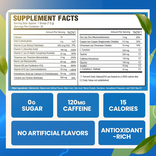 Blue Raspberry Morning Buzz Energy Drink Powder - Sugar-Free Energy Booster with Antioxidants - 30 Servings for Sports Nutrition and Morning Kickstart