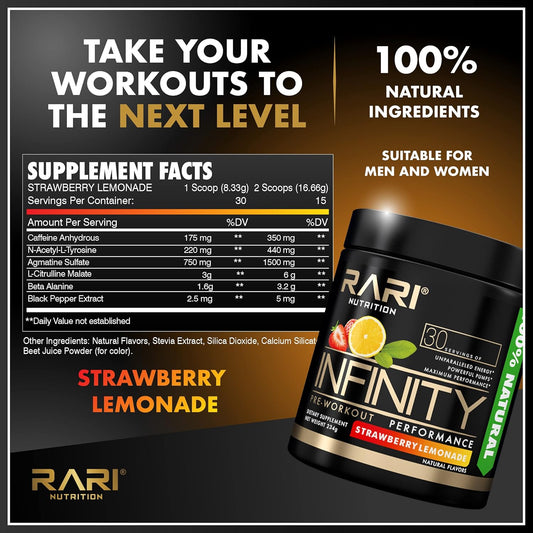 High-Performance Energy Powder for Women and Men - RARI Nutrition Infinity Pre Workout Performance - 30 Servings - Strawberry Lemonade