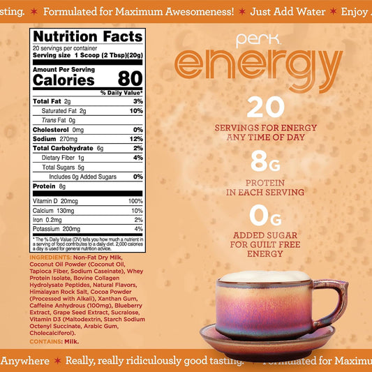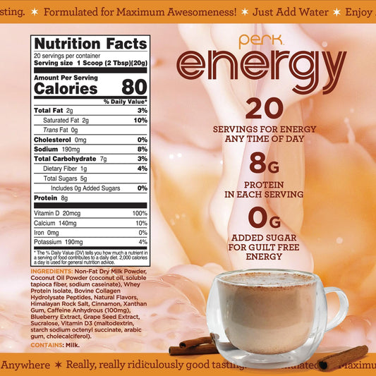 Perk Energy Original Horchata Powder - 20 Servings, Gluten-Free & Peanut-Free Energy Drink