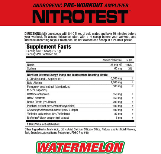 Nitrotest Pre-Workout Supplement Drink by MuscleMeds - Boost Nitric Oxide & Testosterone - Watermelon Flavor - 30 Servings - 1.03lb