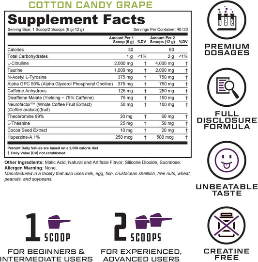 Cutler Nutrition Prevail Pre Workout Powder: Energy and Focus Supplement with Nootropics, L Citrulline, Alpha GPC, L Tyrosine - Cotton Candy Grape, 40 Servings for Men and Women