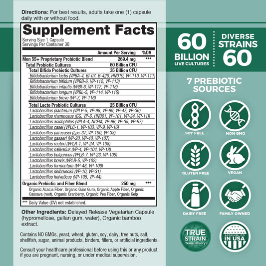 Vital Planet Vital Flora Men 55+ Probiotic - 60 Billion CFU, 60 Strains, 7 Prebiotics - Immune & Digestive Support, Gas Relief - 30 Capsules