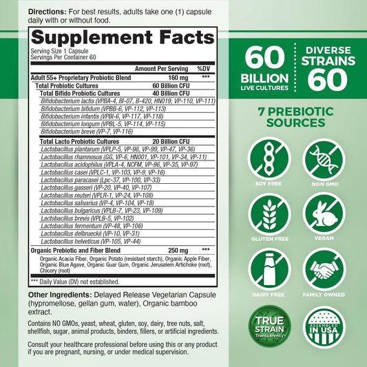 Vital Planet Vital Flora Probiotic for Adults Over 55 - 60 Billion CFU, Organic Prebiotics, Immune & Digestive Support - 60 Capsules