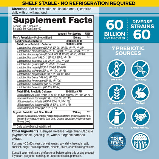 Vital Planet Men's Probiotic - 60 Billion CFU, 60 Strains, 7 Organic Prebiotics - Immune Support, Gas Relief, Digestive Health - 60 Capsules