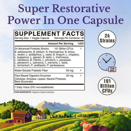 Vitalitown Probiotic Supplement: 101 Billion CFUs, 24 Strains, Enzymes, Prebiotics, Shelf Stable, Men & Women, 30 Caps