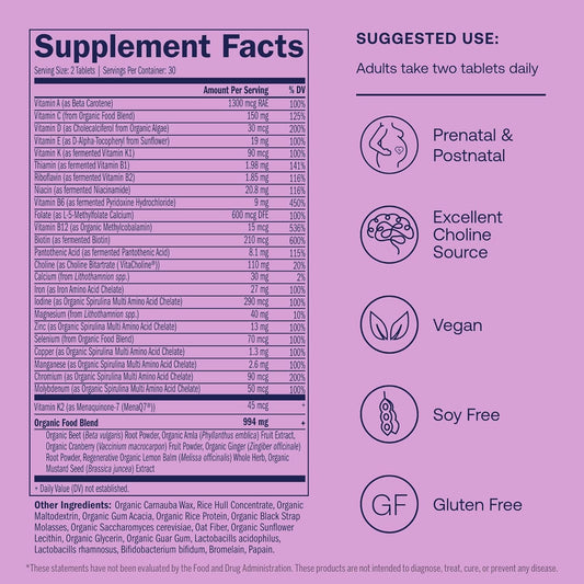 Prenatal Multivitamin for Healthy Mom & Baby - 60 Vegan Tablets with Methylfolate & Choline - Gluten & Soy Free - 30 Servings