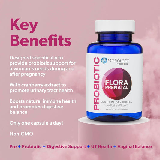 Probiology Flora Prenatal Capsules - Probiotic & Prebiotic Supplement for Prenatal Women - Non-GMO, Vegan, Gluten Free - 30 Capsules