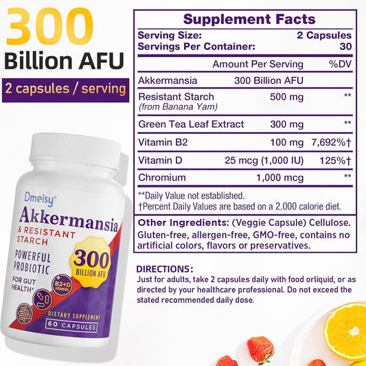 Akkermansia Probiotic Supplement for Gut Health - 300 Billion AFU Akkermansia Muciniphila, Boosts GLP-1, Digestive, Immunity, 60 Count
