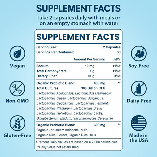 300 Billion CFU Probiotics for Gut Health - Organic Prebiotics Blend, 12 Strains Probiotic Supplement for Women and Men - 60 Capsules