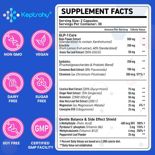 Natural GLP-1 Support Supplement with Synbiotics, Hops Extract, Eriocitrin - 120 Capsules for Men and Women