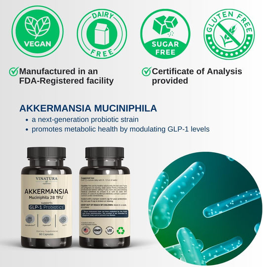 60 Capsules of VINATURA Akkermansia Probiotic with Akkermansia Munciniphila and GLP-1 Support