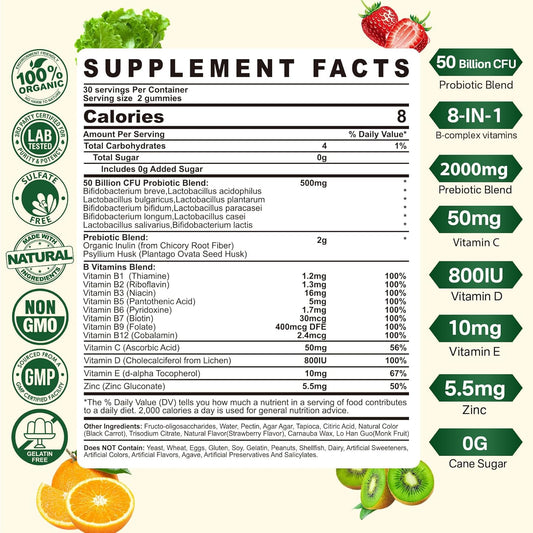 Fiber Probiotics Gummies with Prebiotics for Gut & Immune Health - 50 Billion CFUs, Inulin, Psyllium Husk & Multivitamin - Vegan, 2 Pack