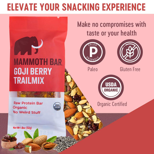 Organic Mammoth Bar Goji Berry Trail Mix with 12g Protein - Premium Ingredients: Almonds, Pistachios, Sunflower Seeds, Dates, Egg White. Paleo, Gluten Free, Raw