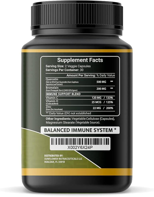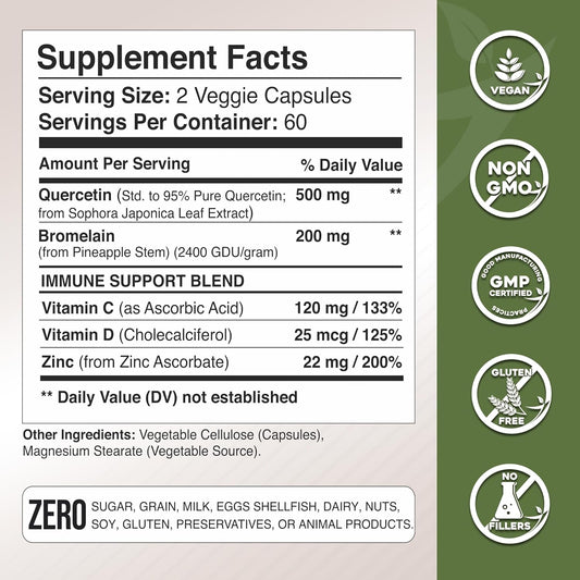 Quercetin with Vitamin C, Zinc, and Bromelain - 500mg Capsules - 60 Count - Non-GMO, Gluten-Free, Vegan - 2 Month Supply
