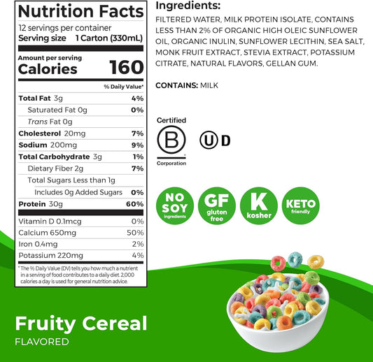 Orgain Fruity Cereal High Protein Shake - Dairy Isolate, 30g Protein, 6g BCAAs, <1g Sugar, Meal Replacement, Ready to Drink, Keto & Gluten-Free - 11 Fl Oz (Pack of 12)