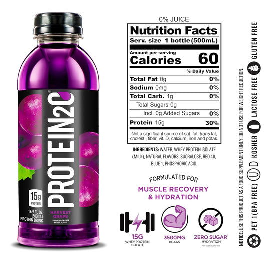 Protein2o Harvest Grape Infused Water, 15g Whey Protein, Ready-To-Drink, 16.9 oz Bottle, Sugar-Free, Gluten-Free, Lactose-Free - Pack of 12