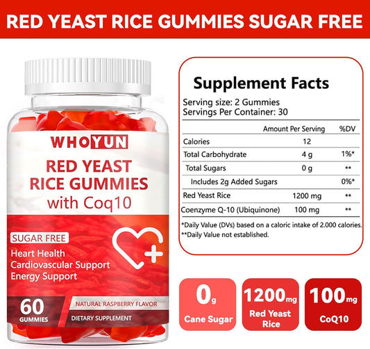 Sugar-Free Whoyun Red Yeast Rice CoQ10 Gummies - 60 Chewables for Heart Health & Cholesterol Support