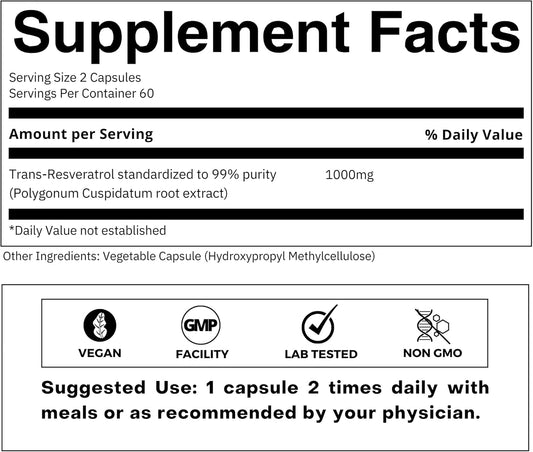 Premium Resveratrol Capsules - 99% Trans-Resveratrol - Japanese Knotweed Extract - Immune & Anti-Aging Support - 120 Capsules