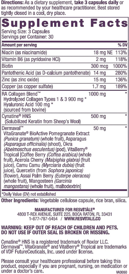 ResVitale Beauty 3 Skin Care Supplement with Collagen, Keratin, Elastin - 90 Caps & Resveratrol 250mg Supplement - 120 Caps for Men and Women