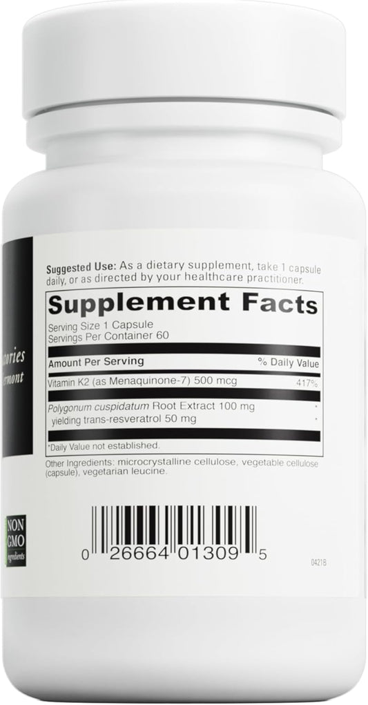 Vitamin K2 & Resveratrol Supplement for Bone and Heart Health - Antioxidant Support - Vegetarian, Gluten-Free, Soy-Free - 60 Capsules