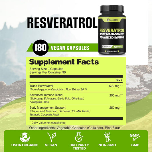 180 Capsules of WELBUDA Trans-Resveratrol Powder Extract 30:1 with Olive Leaf & Quercetin - Immunity, Heart Health & Body Management Support Formula