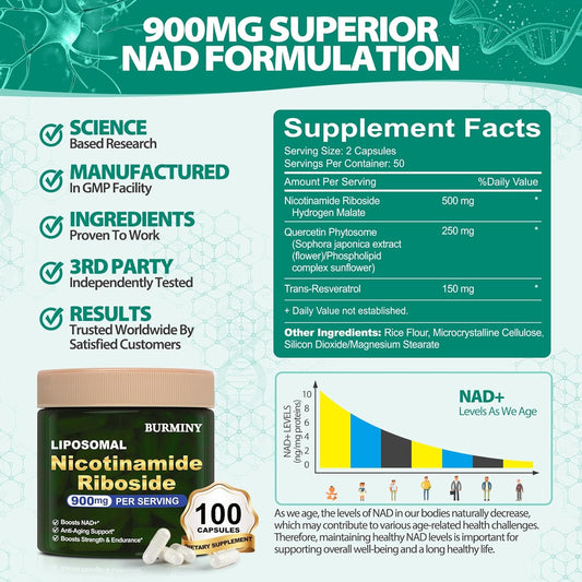 Liposomal NAD Supplement 900 MG with NR Resveratrol Capsules - Boost NAD+ for Cellular Health, Anti-Aging, Energy & Focus