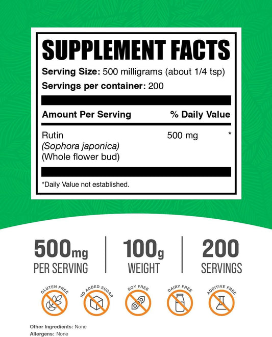 BulkSupplements Rutin Powder - Sophora Japonica Extract, 500mg Rutin Supplement - Antioxidant Source, Soy-Free, 100g (3.5 oz) Pack
