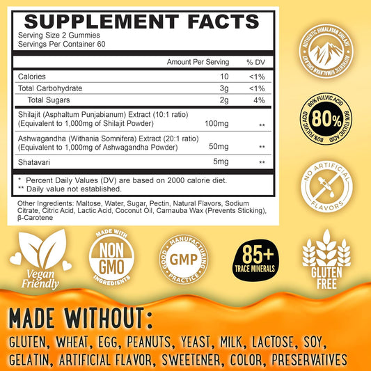High Potency Gold Grade Pure Himalayan Shilajit Gummies with Ashwagandha & Shatavari - Energy Boost & Immune Support - 120 Gummy - Peach & Mango Flavor