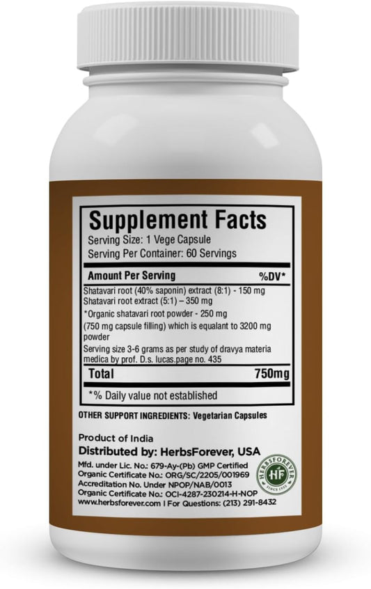 Premium Shatavari Capsules - 750mg High-Potency Supplement with 40% Saponins - 60 Vegetarian Capsules for Herbal Wellness & Balance Support