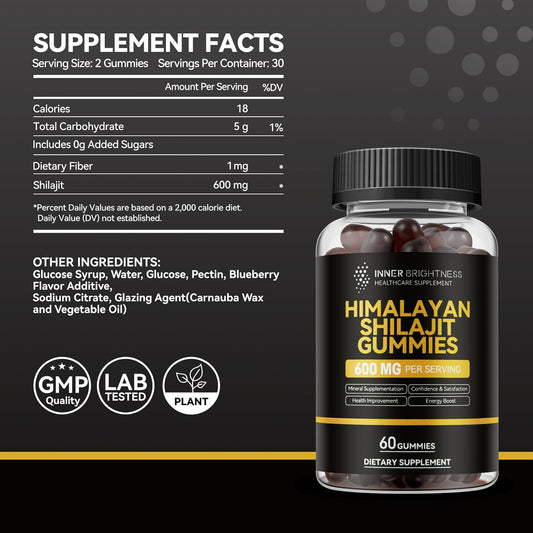 600mg Inner Brightness Shilajit Gummies for Men & Women - Non-GMO, Gluten-Free, Sugar-Free - Boost Energy, Immunity, Stamina - 60 Count