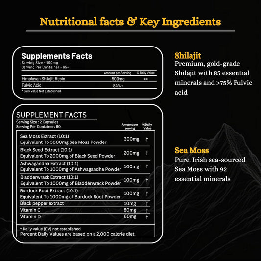 Sea Moss, Shilajit, and Black Seed Oil Vitality Bundle - 500mg Shilajit, 3000mg Sea Moss, 2000mg Black Seed Oil, 1000mg Ashwagandha, Burdock Root & Bladderwrack - Men & Women - 30 Day Supply