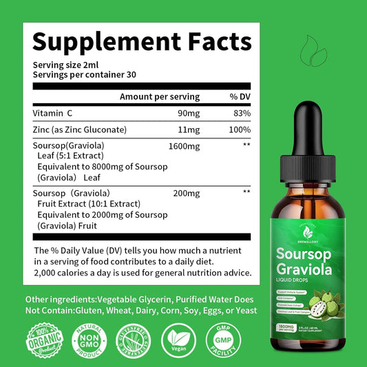 Soursop Graviola Liquid Drops - Cell Support, Sleep Aid, Skin Health - 1800mg Leaf & Fruit Extract - 2 Fl Oz