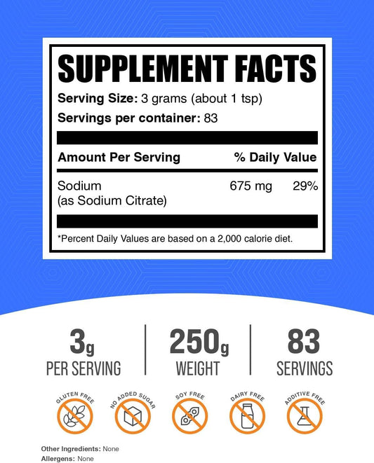 Sodium Citrate Powder - Food Grade Sodium Supplement for Emulsifying and Enhancing Flavor - Gluten Free, 3g per Serving, 250g Pack