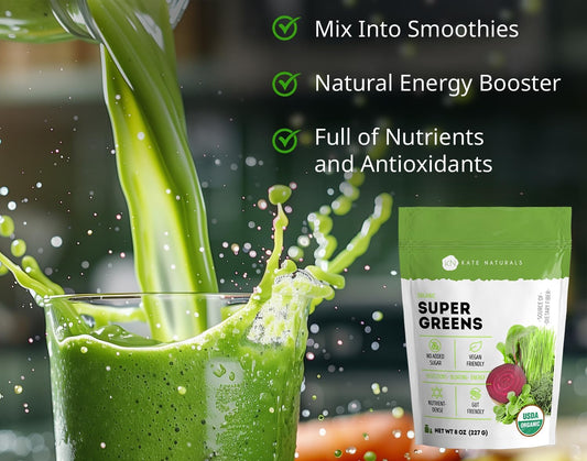 Kate Naturals Super Greens Powder with Probiotics - Antioxidant & Daily Fiber Supplement for Energy & Digestive Support - Organic Superfood Mix (30 Servings, 8oz)