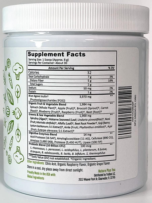 Organic Super Greens Powder Blend with Spirulina, Alfalfa, Probiotics, Fiber, Digestive Enzymes - Non-GMO, No Artificial Sweeteners - 30 Servings