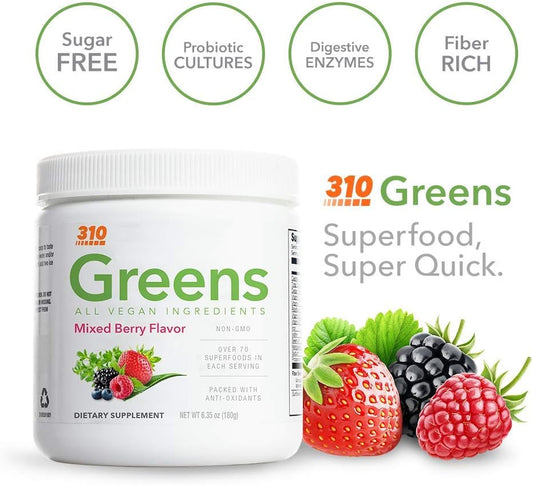 310 Nutrition Organic Superfood Greens Juice Powder with Spirulina - Mixed Berry, 30 Servings - Gut Health & Metabolism Support with Probiotics & Antioxidants