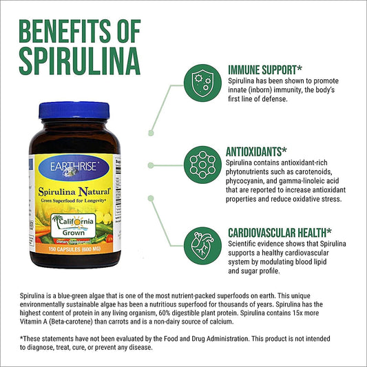 California Natural Premium Earthrise Spirulina Capsules 600mg - 150 Count, Vegan Keto Superfood, Gluten-Free & Non-GMO, Rich in Vitamins & Minerals