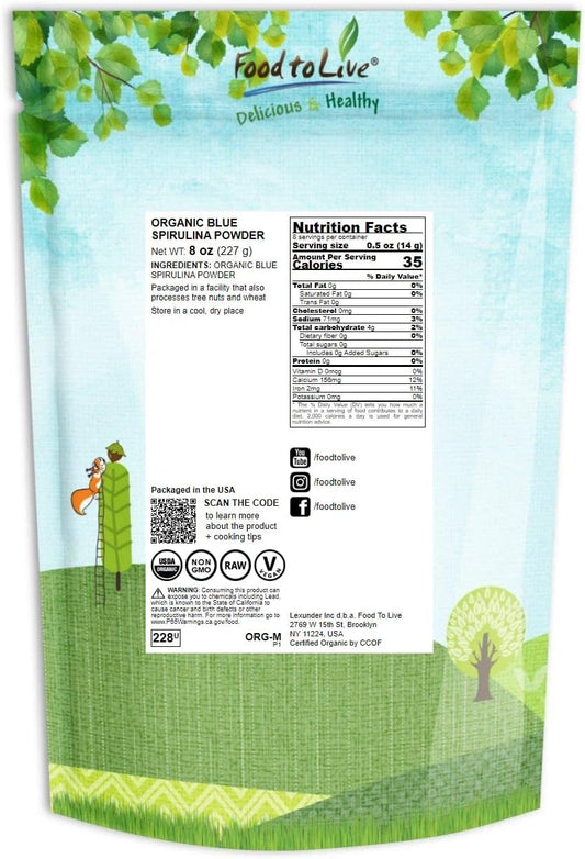 Organic Blue Spirulina Powder 8oz - Non-GMO Vegan Algae Extract for Smoothies, Juices, Shakes & Food Coloring